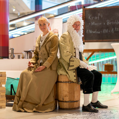 Isaak Newton und Bertha Benz präsentierten spannende Experimente aus der Welt der Naturwissenschaften und des Tüftelns.